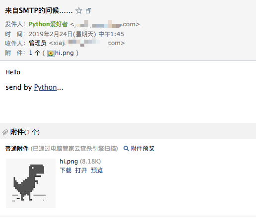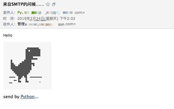 server = smtplib.SMTP_SSL(smtp_server, 465) # SMTP SSL协议默认端口是465,注意使用SMTP_SSL server.set_debuglevel(3) try: server.login(from_addr, password) server.sendmail(from_addr, [to_addr], msg.as_string()) server.quit() except Exception as e: print(e)