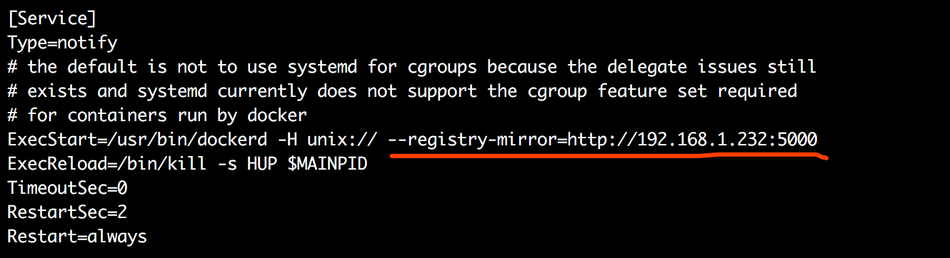 1 2 3 vim /etc/systemd/system/multi-user.target.wants/docker.service #加入 ExecStart=/usr/bin/dockerd -H unix:// --registry-mirror=http://192.168.1.232:5000