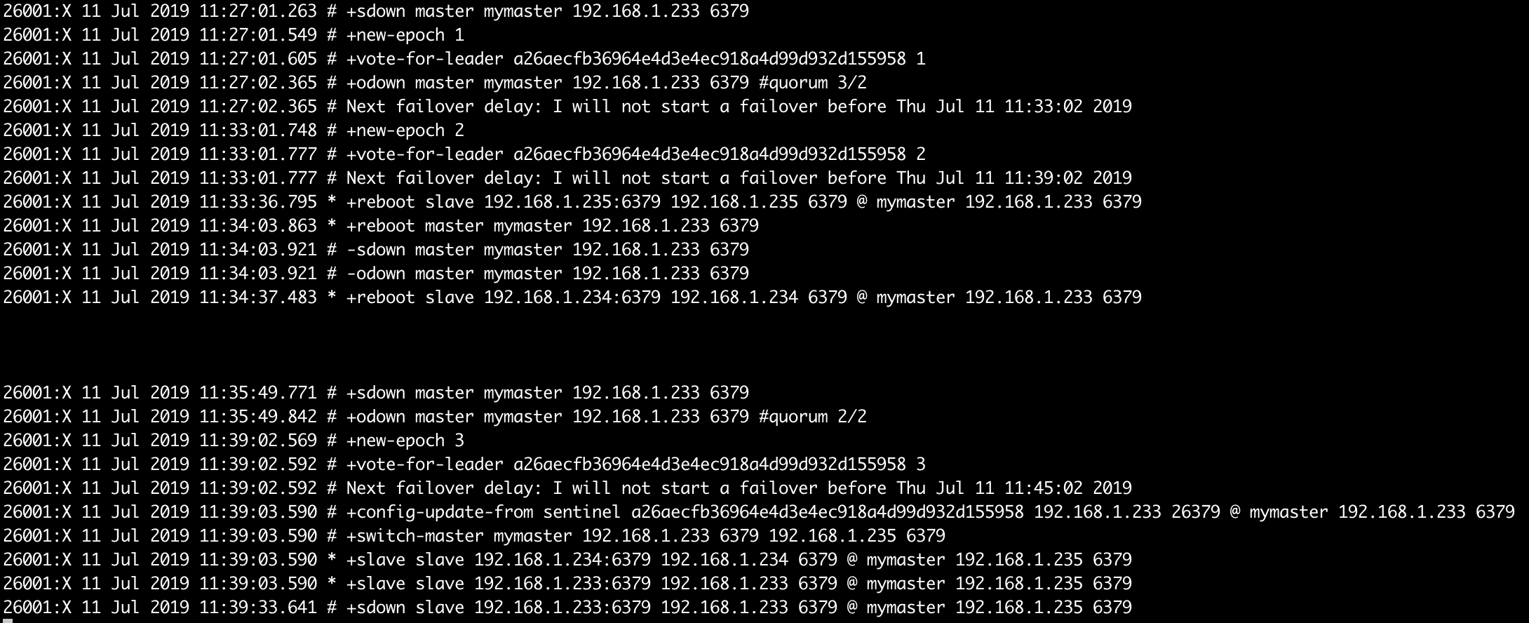 * 发现master故障, * 选举出来233为master * 切换master * 更新sentinel配置文件 * 将原来的master切换为slave,并且定义为down - 观察sentinel配置文件,master已经切换为新的地址