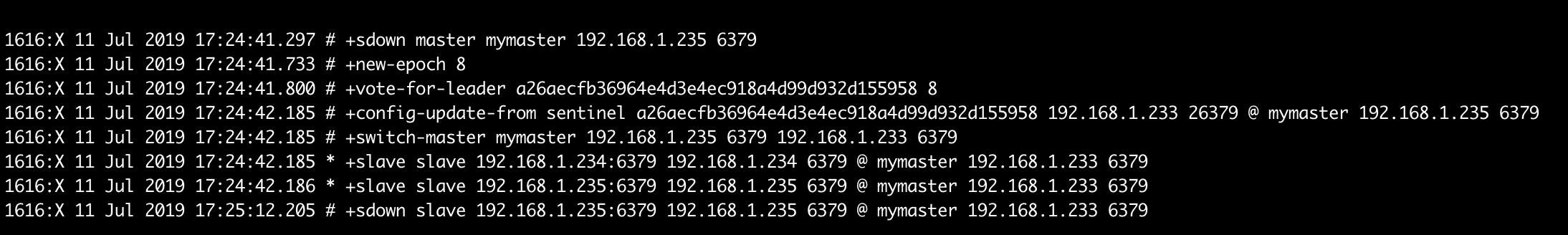 * 发现master故障, * 选举出来233为master * 切换master * 更新sentinel配置文件 * 将原来的master切换为slave,并且定义为down
