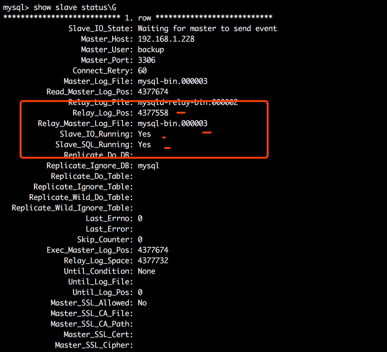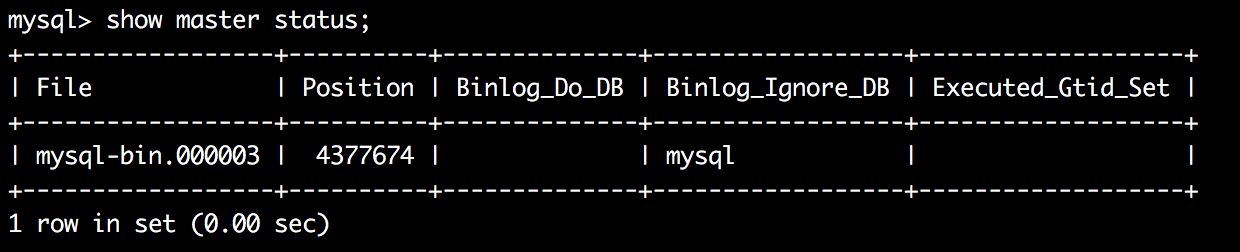 #1.创建账号并授权 GRANT REPLICATION SLAVE ON *.* TO backup@'%' IDENTIFIED BY 'backup'; flush privileges; #2.锁表 FLUSH TABLES WITH READ LOCK; #3.查看当前状态 show master status;